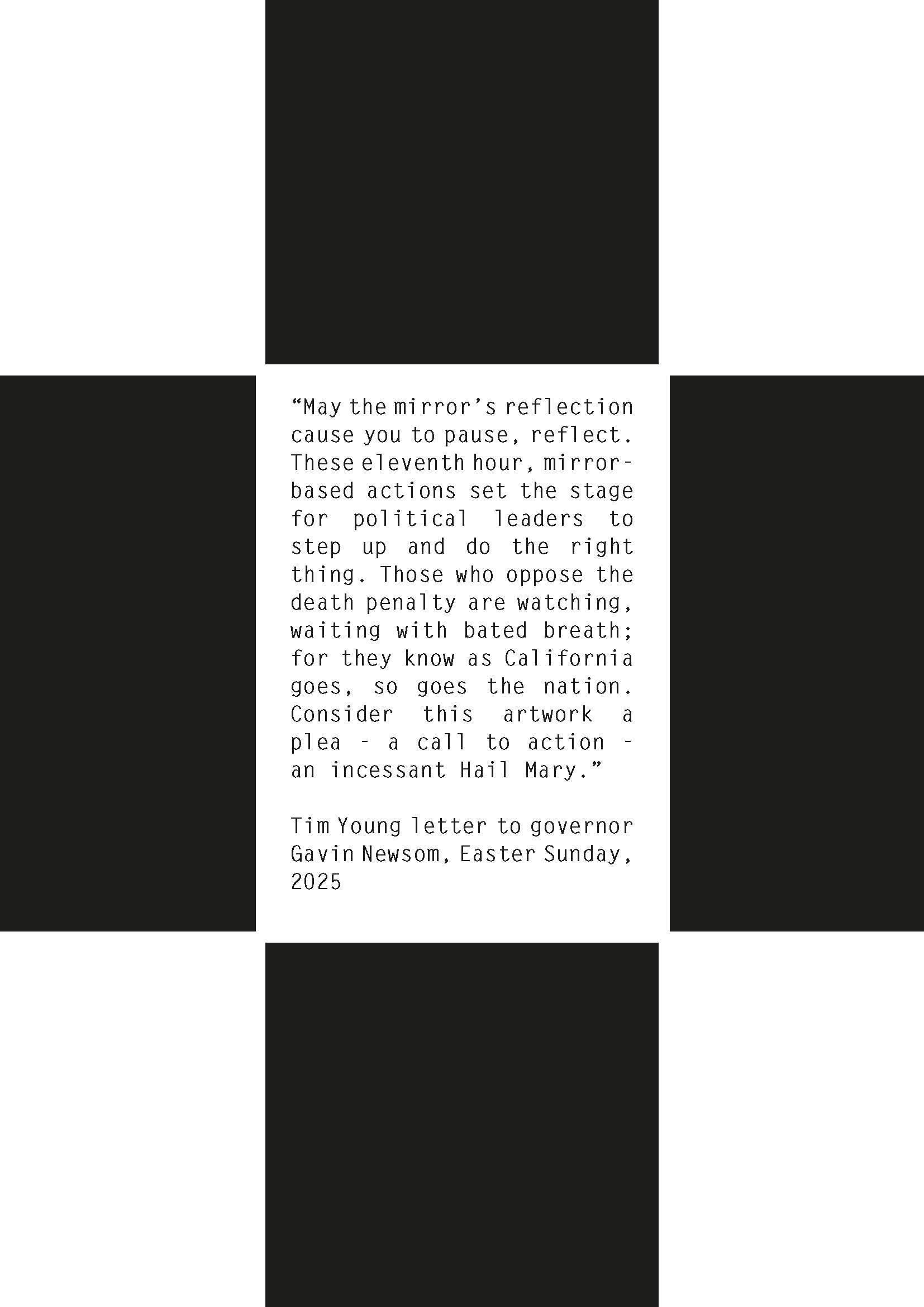 California has the nation’s largest death row population, numbering around 580 individuals, of which Young is one. The artwork envisages 580 limited edition soaps. Sentenced to death by 12 non-Black jurors for crimes he did not commit, Young was arrested on Easter Sunday 1999. Twenty-seven years on, the governor’s soap is the first of 580 Hail Mary Soap bars Young hopes to make. Each bar is to be engraved with the words “clemency, pardon, commutation” along with the prisoner number of each individual currently on California’s death row.The soap comes in protective cardboard casing, itself an artwork to keep rather than discard. It unfolds into a cross embellished with the numbers of every prisoner on California’s death row, and a mirror at the centre. Slipped between the soap and mirror is a letter. It is Tim Young’s open letter to governor Gavin Newsom, written on Easter Sunday 2025, the 26th anniversary of Tim’s arrest.